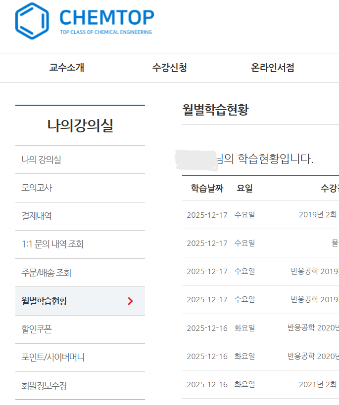 | 수강강좌(교수님) | 화공기사 필기 패키지(이론+기출) 무료연장(박병선, 윤진규, 이홍주) | 평 가 | ![]() |